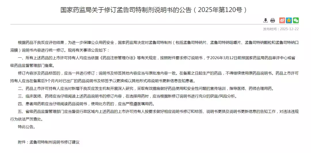 药监局关于修订孟鲁司特制剂说明书的公告(2025年第120号)根据药品不良反应评估结果,为进一步保障公众用药安全, 药监局决定对孟鲁司特制剂(包括孟鲁司特钠片、孟鲁司特钠咀嚼片、孟鲁司特钠颗粒和孟鲁司特钠口溶膜)说明书内容进行统一修订。现将有关事项公告如下:一、所有上述药品的上市许可持有人均应当依据《药品注册管理办法》等有关规定,按照附件要求修订说明书,于2026年3月12日前报 药监局药品审评中心或省级药品监督管理部门备案。修订内容涉及药品标签的,应当一并进行修订;说明书及标签其他内容应当与原批准内容一致。在备案之日起生产的药品,不得继续使用原药品说明书。药品上市许可持有人应当在备案后9个月内对已出厂的药品说明书及标签予以更换或以其他形式将说明书更新信息告知患者。二、药品上市许可持有人应当对新增不良反应发生机制开展深入研究,采取有效措施做好药品使用和安全性问题的宣传培训,指导医师、药师合理用药。三、临床医师、药师应当仔细阅读上述药品说明书的修订内容,在选择用药时,应当根据新修订说明书进行充分的获益/风险分析。四、患者用药前应当仔细阅读药品说明书,使用处方药的,应当严格遵医嘱用药。五、省级药品监督管理部门应当督促行政区域内上述药品的上市许可持有人按要求做好相应说明书修订和标签、说明书更换及说明书更新信息的告知工作,对违法违规行为依法严厉查处。特此公告。